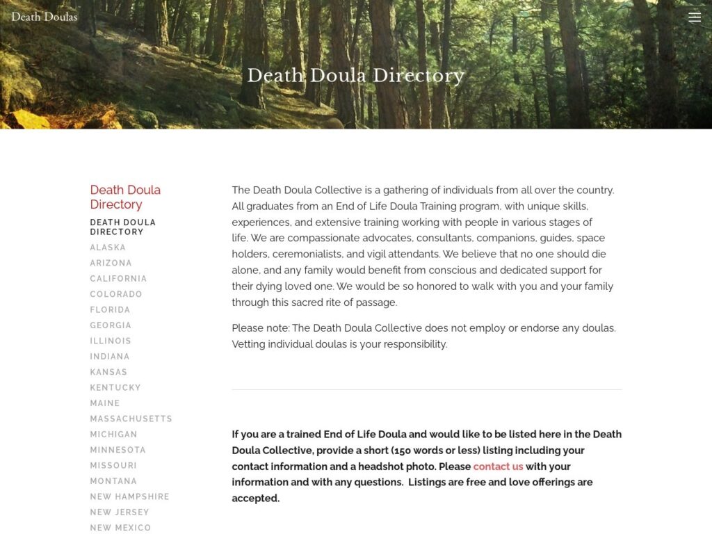 The Death Doula Collective is a gathering of individuals from all over the country. All graduates from an End of Life Doula Training program, with unique skills, experiences, and extensive training working with people in various stages of life. We are compassionate advocates, consultants, companions, guides, space holders, ceremonialists, and vigil attendants. We believe that no one should die alone, and any family would benefit from conscious and dedicated support for their dying loved one. We would be so honored to walk with you and your family through this sacred rite of passage. Individual doulas have not been vetted. [LINK]