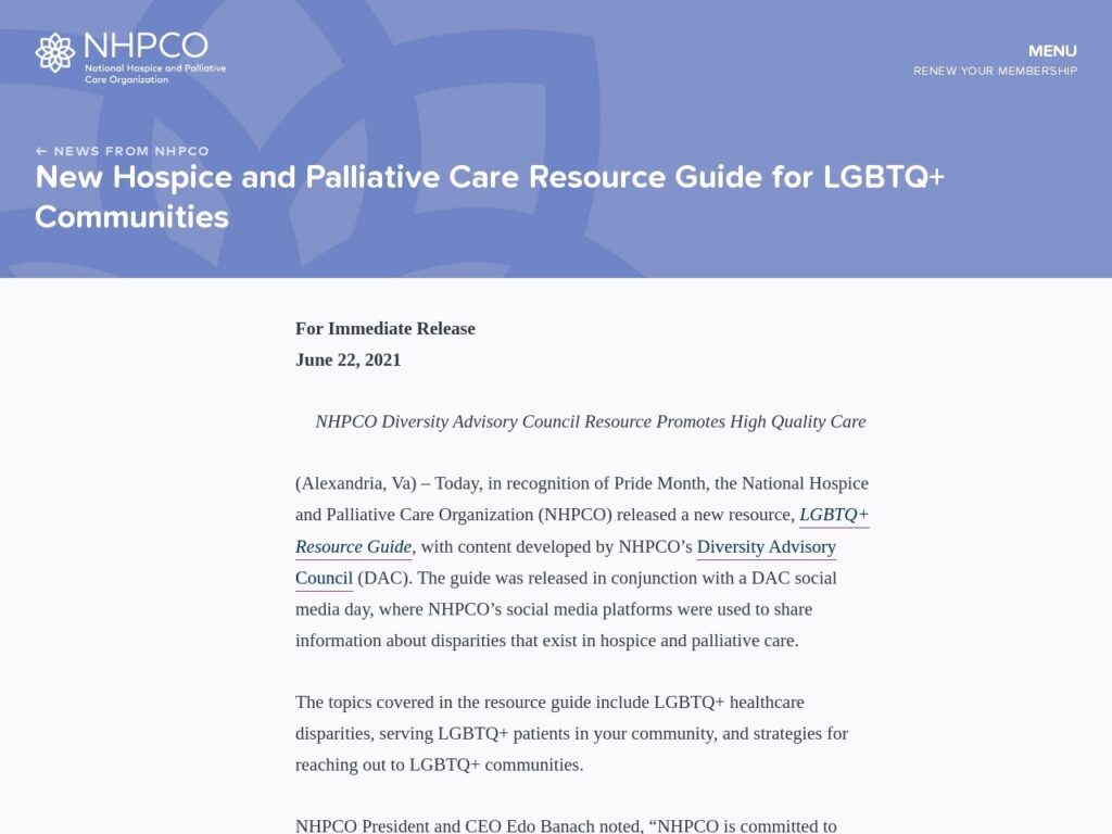 NHPCO is committed to helping underserved communities access the person-centered care they deserve. Hospice providers have a history of meeting the unique needs of diverse communities going back to the early days of the AIDS pandemic in the 1980s when compassion, dignity, and care were so desperately needed by those marginalized at the time. With a strong foundation and the support of resources like this LGTBQ+ resource guide, we hope all hospices and palliative care providers will provide the best care possible to LGBTQ+ patients and families. [LINK]