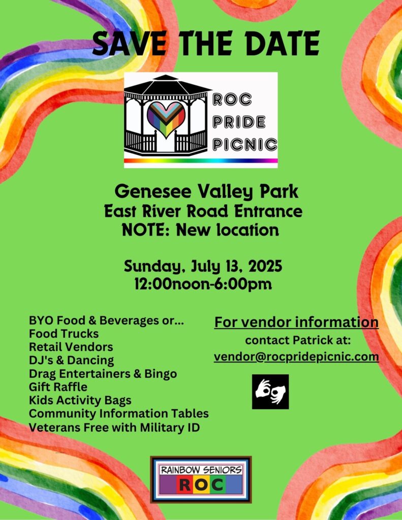 The Pride Picnic has been a Rochester tradition for over 50 years and we expect record attendance this year! The event is mainly a “bring your own” food and beverage picnic, though there will be some food trucks there. Entertainment includes dancing with a DJ, Drag performances, Drag BINGO, a fabulous Gift Raffle, Children’s Activity Packs, and more.